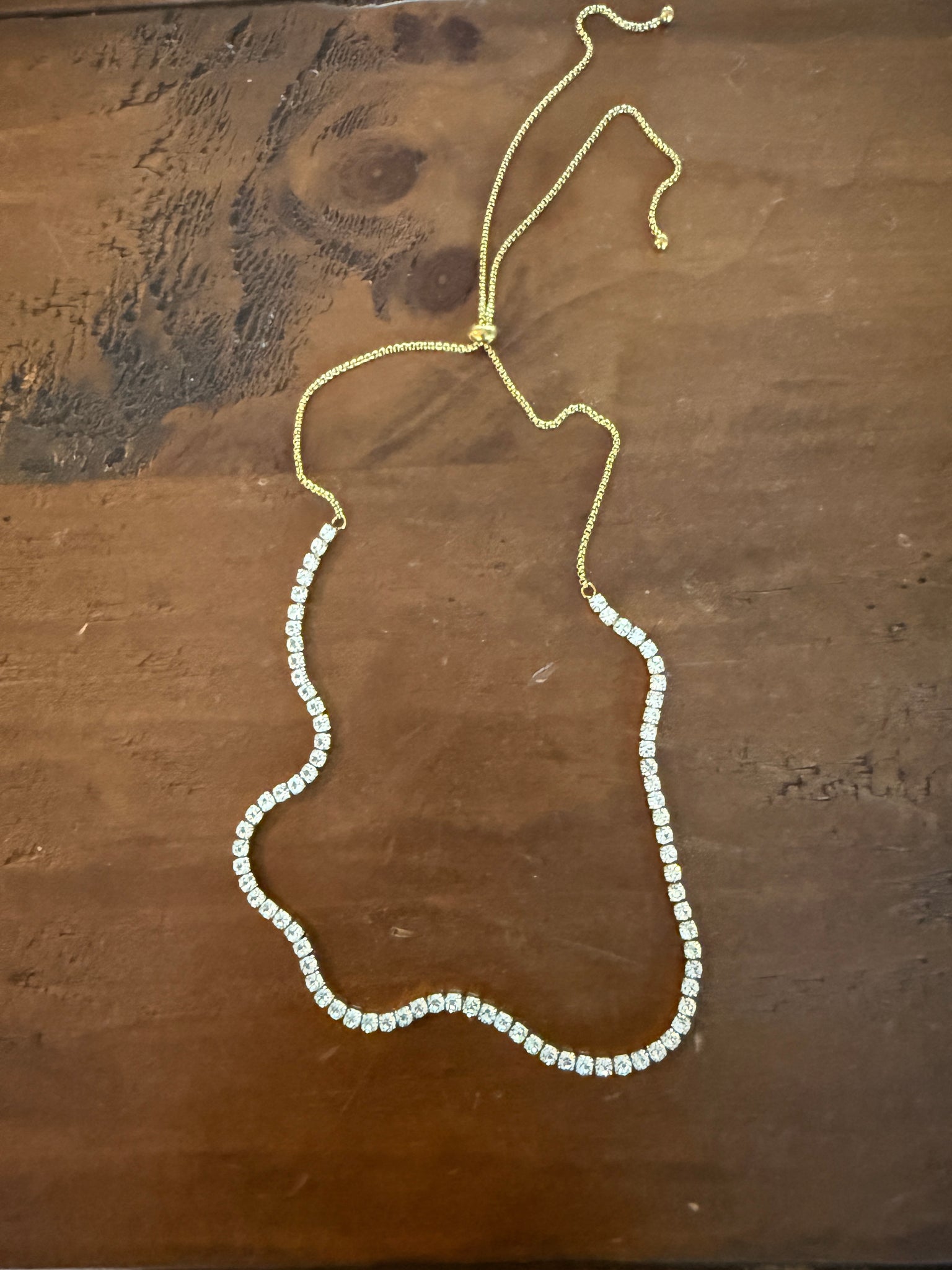 it's finally here! we searched hi and low to find the perfect tennis necklace to bring to ya'll! we love this one! it's water, sweat proof and adjustable! a pull chain at the back allows you to adjust your length.